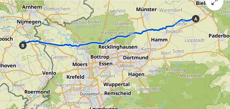 | Diesen langjährigen Traum habe ich mir im August 25 erfüllt, und habe unsere langjährigen (56 Jahre) Freunde Joke und Harald in Wilbertoord besucht. Morgen um 6.15 Uhr fuhr ich los, nachmittags um 16 Uhr war es geschafft, ebenso die 220km. Zur Belohnung gab es Fritten, Frikadell spezial und ein Softeis. Die Rückfahrt erfolgte mit dem Rad nach Goch und weiter mit dem Zug nach Gütersloh. Die Tour ist gespeichert bei komoot | |