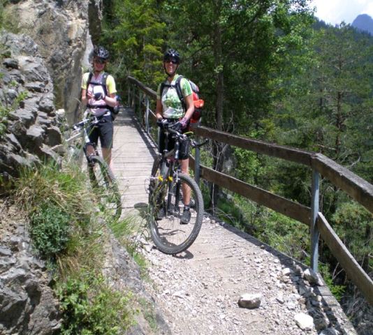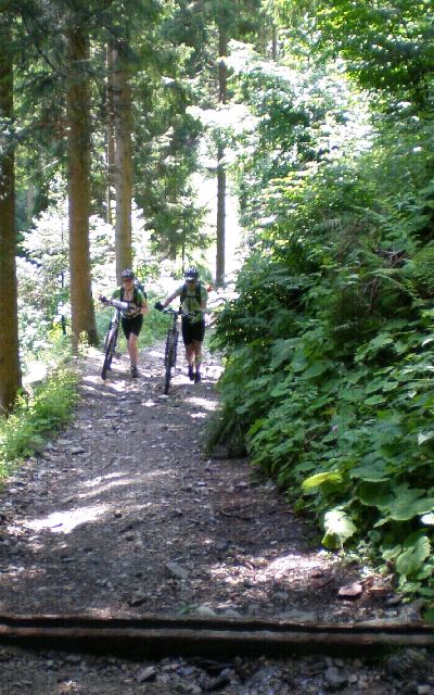 Auf dem Panoramaweg unterhalb der Zugspitze fuhren wir durch einen Lerchenwald Richtung Fernpass. Nach einigen kurzen Schiebepassagen (steile Schotterrampen), einem super Trail über den Campingplatz Fernsee ging’s dann nach Nassereith. Über den Höhenweg fuhren wir nach Imst und von dort ging es nach Schönwies, wo wir kein Zimmer fanden. Also mussten wir bis nach Zams weiterfahren. Auf dieser Strecke überraschte uns dann ein Wolkenbruch. So Nass bin ich noch nie gewesen. Dank der Thai- Wirtsleute und einem beheizbaren Schrank waren unsere Kleider am nächsten morgen wieder trocken.