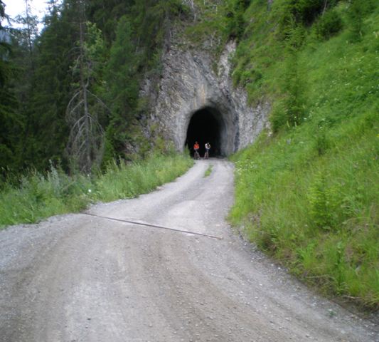 Unsere Königsetappe. Entlang des Inn ging es durch Landeck (schwierige Wegfindung) im gemütlichen Auf und Ab bis Urgen. Dann aber steil bergauf nach Hochgallmig, 7 km – 650 Hm. Also wesentlich steiler, als die Straße zum „Peter auf`m Berge“. Auf Waldwegen nochmals eine ¾ h bergauf. Oben erwarteten uns wunderschöne Trails runter nach Obladies und Fiss. Eine 6 km lange Abfahrt führte von Serfaus nach Tschupbach. Durch blühende Wiesen auf asphaltierten Radwegen ging es über Pfunds zum schweizerischen Grenzort Martina. Ab hier sollte der letzte Aufstieg, 600 Hm, zur Norbertshöhe erfolgen. Aber wir hatten Pech. Genervt durch Regenschauer, einen unbeleuchteten Tunnel, gesperrter Forstwege und einer ¾ h Schiebepassage erreichten wir den nicht eingeplanten Schwarzsee oberhalb von Nauders. Aber dieses wunderschöne Panorama am See, die Ruhe und die wunderschöne Abfahrt nach Nauders haben uns für vieles entschädigt.