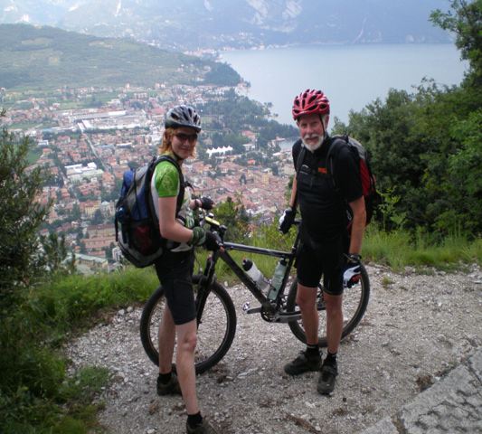 Das Finale. Auf schmalen Wegen entlang des Molvenosees, durch das Trentin Richtung Riva. Nach 23 km der erste richtige Aufstieg über 7 km, 600 Höhenmetern und vielen Schiebepassagen. Während Tanja und Katrin die verlorene Kamera suchten, durfte ich mich Gott sei Dank 50 Min. ausruhen. Die Kamera wurde gefunden. Den ersten Ausblick auf den Gardasee werde ich nie vergessen, aber noch lagen 22 km vor uns. Eine Schiebepassage, diesmal bergrunter- aber dann hinab zum Tennosee. Zum letzten Male erfolgte ein Aufstieg nach Campi, aber dann die weltbekannte Abfahrt ADRENALINA zum Gardasee.