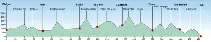 Mittwoch: Zams 8:00 – Nauders 18:15 h, 73 km, 2.020 Hm, 6.725 Kal.