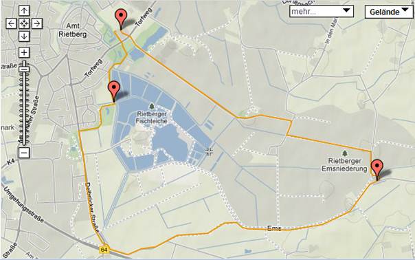 dieser Wanderung. Gute Parkmöglichkeiten am Busbahnhof bzw. am Schulzentrum. Direkt gegenüber , am Haupteingang des Gartenschaugeländes, startet die Tour am Freibad vorbei, entlang der Ems, bis zur Aussichtsplattform. Hier kannst Du dir einen Überblick über die vielen Emsteiche machen. Weiter geht Du zur Johanneskapelle aus dem 18. Jahrhundert. Direkt gegenüber siehst Du die Eichenallee, die zum ehemaligen Rietberger Schloss, dem heutigen Rietberger Gestüt, führt. Weiter, entlang der Delbrücker Strasse, bis zur Kreuzung der B 64, links ab in den Birkendamm. In einer Rechtskurve gehst Du geradeaus in die Rietberger Emsniederung. Ein wunderschöner Weg, entlang der Ems, führt Dich zur Antfängers Mühle. Erst durch Wiesen, später über die Straße " An den Teichwiesen", erreichst Du das Gartenschaugelände und die Innenstadt. |